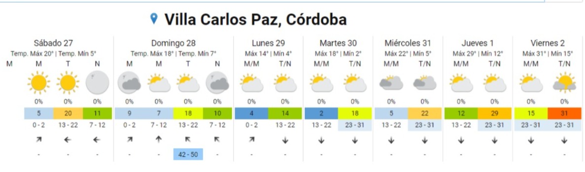Este sábado en Carlos Paz comenzó con el sol a pleno, aunque la mañana sigue siendo fresca con una mínima de 7 grados. Se espera que el día continúe fresco y agradable, con un viento suave proveniente del sector sur y una máxima de 20 grados.
