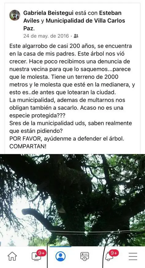 Y dijo sobre la importancia del ejemplar para su familia: “Mis suegros compraron el terreno por ese algarrobo, y se cree que este árbol está antes de la fundación de Carlos Paz. Tuvo la mala suerte de crecer próximo a una medianera. A mi vecino le empezó a molestar porque creció mucho, de allí que pedía sacarlo e hizo una denuncia al municipio. En un momento el árbol derribó la medianera y tuvimos que reconstruirla”