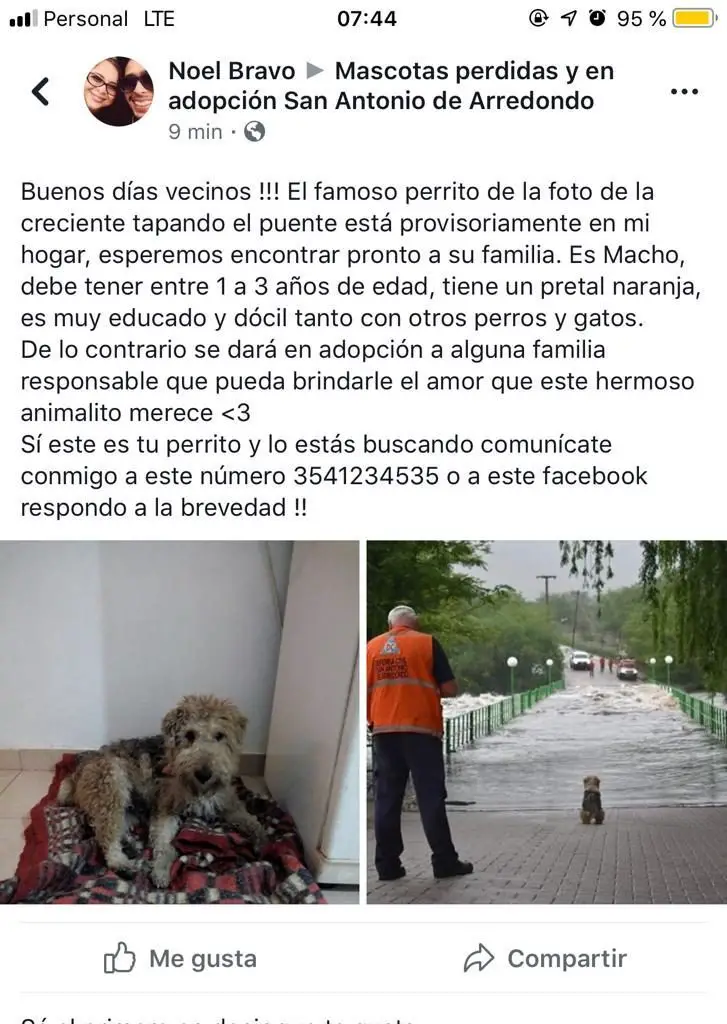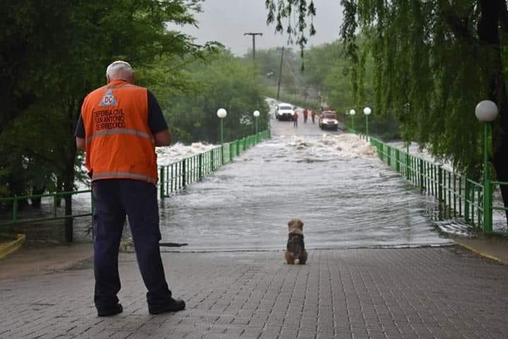La foto, que llegó incluso a la tapa de La Voz del Interior, mostraba al perro junto al encargado de Defensa Civil de esa localidad, mirando el agua pasar por sobre el puente.