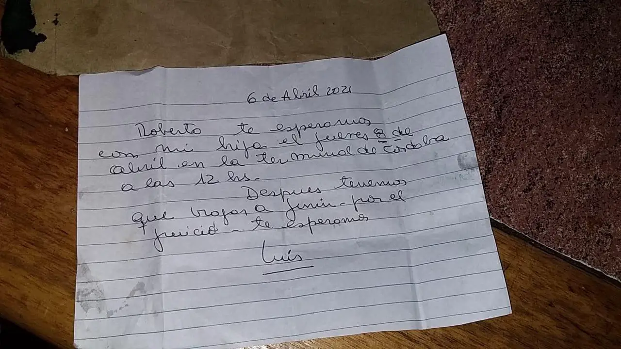 Según indicó La Nueva Mañana, el 6 de abril recibió la segunda nota que decía: “Roberto, te esperamos con mi hija el jueves 8 de abril en la Terminal de Córdoba a las 12. Después tenemos que viajar a Junín por el juicio. Te esperamos. Luis».