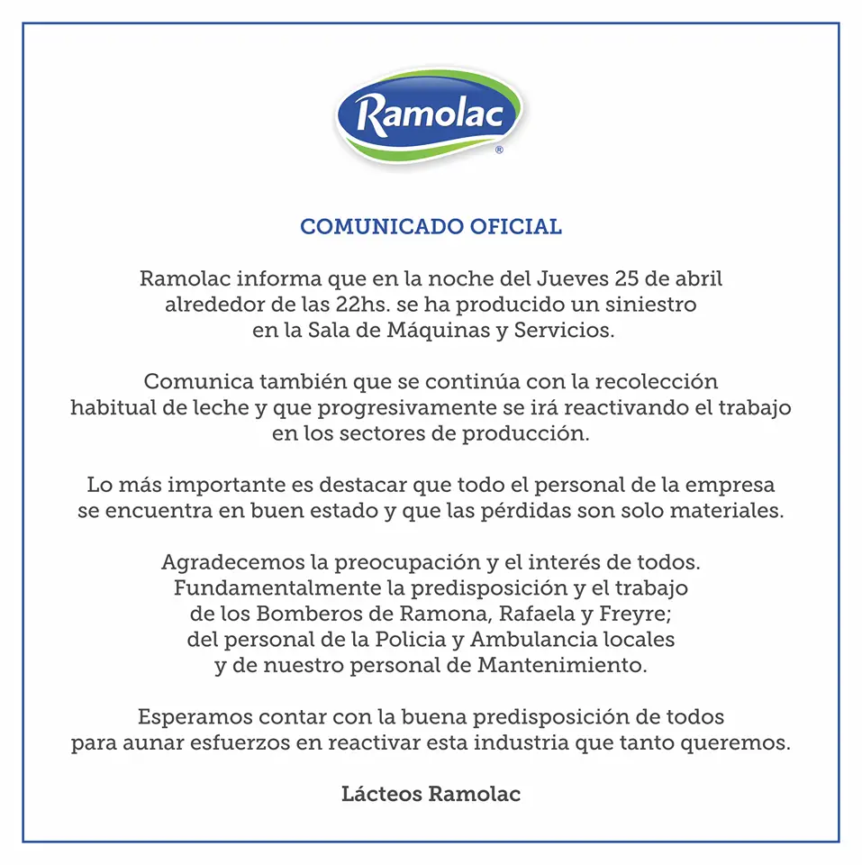 Un incendio provocó serias pérdidas materiales en la planta que posee la industria láctea Ramolac en las afueras de la localidad de Ramona, cercana al límite provincial con Córdoba. “Voló una canilla de amoníaco y producto a eso se reinició la caldera lo que produjo el incendio”, manifestaron trabajadores a Carlos Paz Vivo!