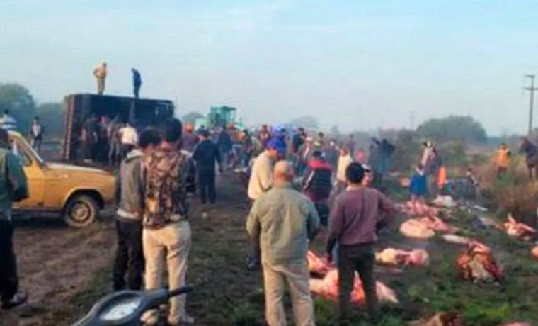 Un camión con 50 vacas volcó en la ruta 11 a la altura del municipio de Calchaquí, provincia de Santa Fe, y este domingo se viralizó un video en las redes sociales en el que se ve cómo los vecinos de la zona faenaban a los animales en el lugar.