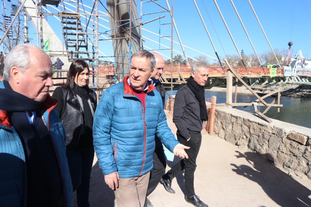 El gobernador Juan Schiaretti llegó este martes para observar la culminación de la parte estructural del puente peatonal que se montó sobre el río San Antonio entre los puentes Carena y Cassafousth. Estuvieron el intendente Daniel Gómez Gesteira, su antecesor Esteban Avilés, la legisladora Mariana Caserio, el ministro de Obras Públicas de la Provincia, Ricardo Sosa y el titular de la Agencia Córdoba Turismo, Julio Bañuelos.
