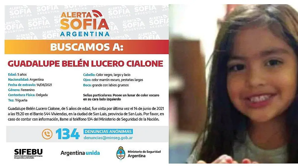 Controles en todos los accesos a la provincia, más de 80 allanamientos en menos de 48 horas, la activación del sistema Alerta Sofía y la difusión de su imagen por Missing Children no lograron hasta el momento dar con el paradero de Guadalupe Belén Lucero de 5 años, quien desapareció el lunes en San Luis.
