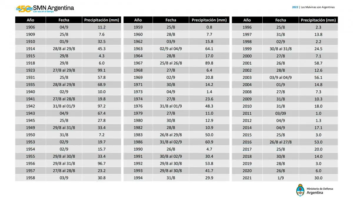 El resultado del análisis demostró que, en los 116 años de registro, en 65 oportunidades (56% de los casos) se produjeron tormentas en esas fechas, aunque no siempre estuvieron asociadas a precipitaciones intensas y/o abundantes.