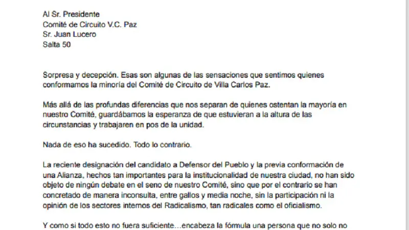 una Alianza, hechos tan importantes para la institucionalidad de nuestra ciudad, no han sido objeto de ningún debate en el seno de nuestro Comité, sino que por el contrario se han concretado de manera inconsulta, entre gallos y media noche, sin la participación ni la opinión de los sectores internos del Radicalismo, tan radicales como el oficialismo», sostiene la carta.