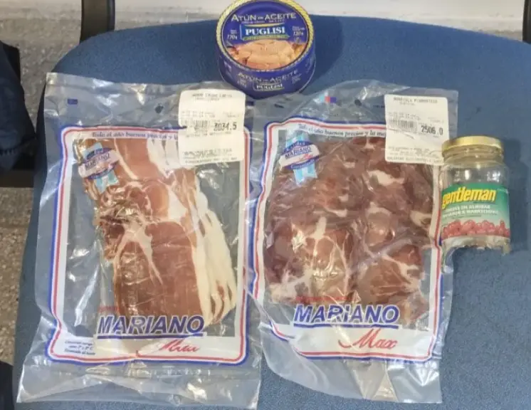 El sujeto intentó irse sin pagar mercadería que había recogido en las góndolas: un paquete con bondiola, otro con jamón crudo, y frascos de mermelada y cerezas.