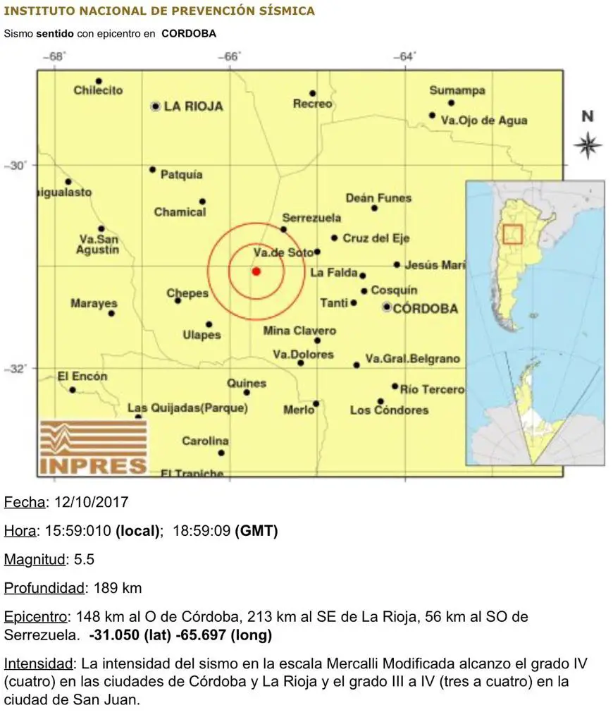 El fenómeno ocurrió a 148 kilómetros al oeste de la ciudad de Córdoba, a 213 kilómetros al sureste de la ciudad de La Rioja y 56 kilómetros al suroeste de la localidad de Serrezuela, según los primeros datos difundidos por el Instituto Nacional de Prevención Sísmica.