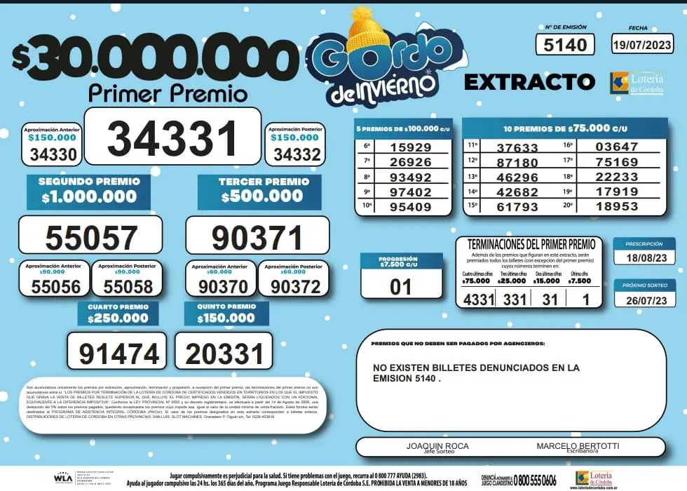 El primer premio, de $30.000.000 correspondió al Nº 34331 y fue cantado a las 21 horas en el Salón de Actos de la Lotería de Córdoba, donde se llevó a cabo este tradicional sorteo extraordinario transmitido en vivo por las plataformas de streaming a través de los diversos canales digitales de la Institución, su página web y redes sociales.