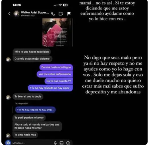 Y agregó: «Me da impotencia hacer todo y que siempre me trates de loca, diciéndome que parezco mi mamá… No es así. Si te estoy diciendo que me estoy enfermando, ayudame como lo hice yo con vos. No digo que seas malo, pero si no hay respeto y no hay ayuda como yo lo hago con vos. Solo me dejás sola y eso me duele mucho. No quiero estar más mal. Sabés que sufro depresión y me abandonás», afirmó Kamila.