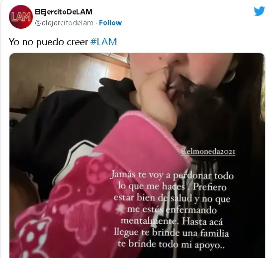 «@Elmoneda2121, jamás te voy a perdonar todo lo que me hacés. Prefiero estar bien de salud y no que me estés enfermando mentalmente. Hasta acá llegué, te brindé una familia y todo mi apoyo. Pero con todo el dolor de mi corazón, te digo chau. Primero está mi hija», escribió Kamila junto a una foto llorando.