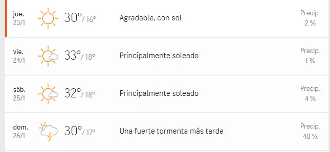 La máxima anunciada para este jueves es de 30 grados, será de 33 grados para el día viernes, 32 de máxima para el sábado y nuevamente 30 para el domingo.