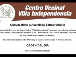 El Centro Vecinal Villa Independencia convoca a Asamblea Extraordinaria