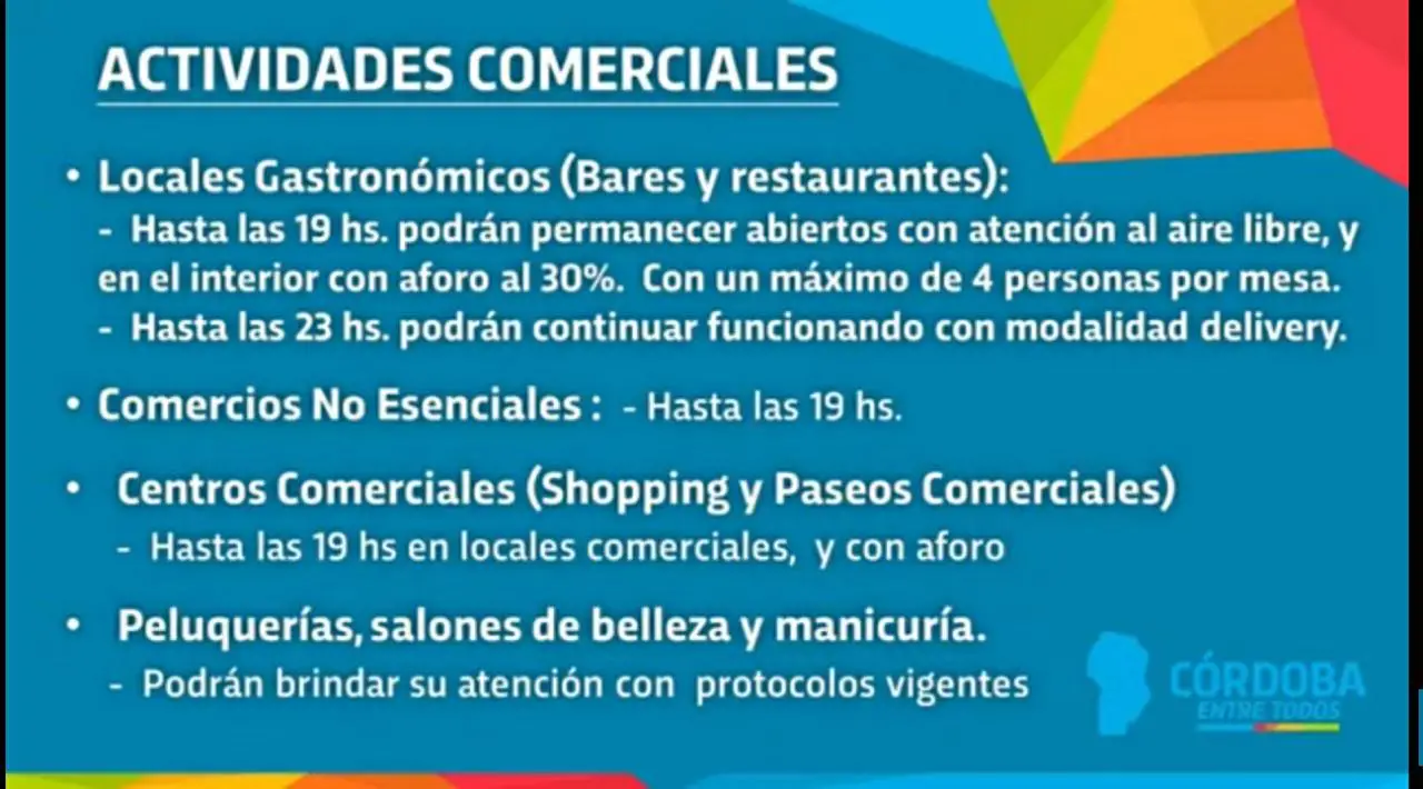 Hasta las 19 hs. podrán permanecer abiertos con atención al aire libre, y en el interior con aforo del 30%.