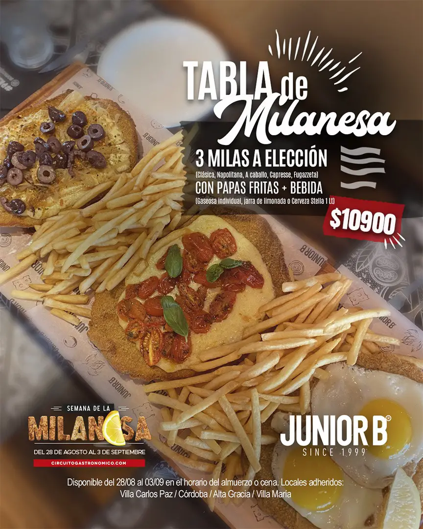Desde el 28 de agosto al 3 de septiembre, en todos los locales de Junior B ubicados en Córdoba, Carlos Paz, Alta Gracia y Villa María lanzaron la super promo «Tabla de Milanesa«.