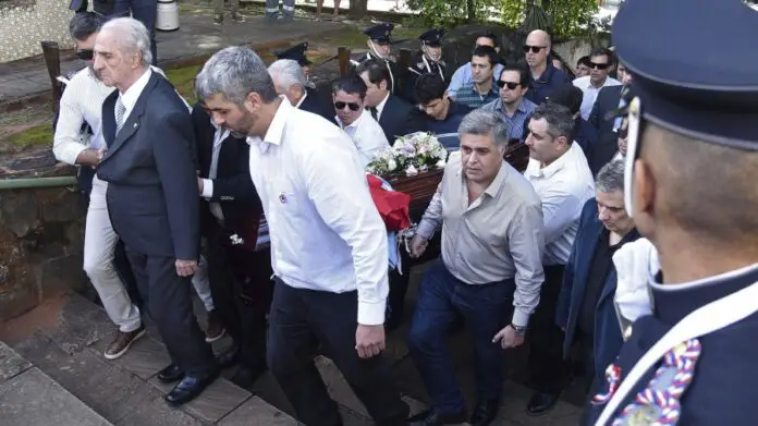 El féretro, que fue velado desde que este sábado llegara procedente de Colombia, fue depositado en el cementerio de La Recoleta envuelto en una bandera paraguaya, otra del club de fútbol Guaraní y otra de la asociación de exalumnos del colegio católico San José.