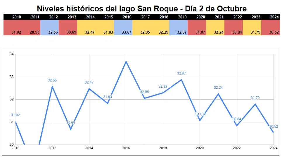 Al comparar los niveles históricos del San Roque en esta misma fecha durante los últimos 14 años, queda en evidencia la gravedad de la situación actual. Desde 2010, solo en 2011 (con 28,95 metros) se registró un nivel más bajo que el actual. Otros años críticos en cuanto a la escasez de agua fueron 2022 (30,84 metros) y 2013 (30,69 metros). La medición promedio para el 2 de octubre durante estos 14 años ha sido de 31,74 metros, lo que resalta el déficit actual.