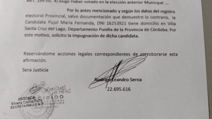 Las razones que aportó Serna se basan en que la abogada no tiene domicilio en Villa Carlos Paz.