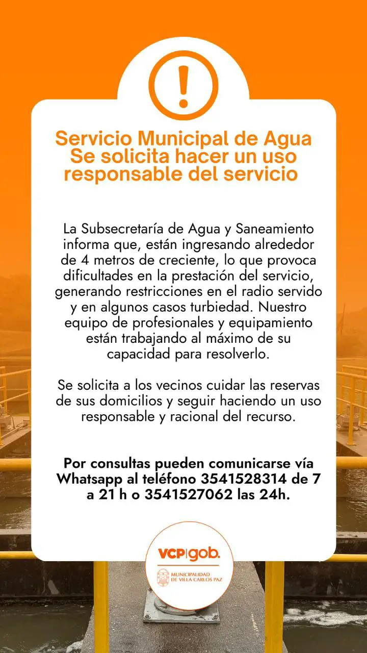 Desde la Subsecretaría de Agua y Saneamiento de Villa Carlos Paz indicaron que el fuerte caudal provoca dificultades en la prestación del servicio, con restricciones en el radio servido y, en algunos sectores, turbiedad.