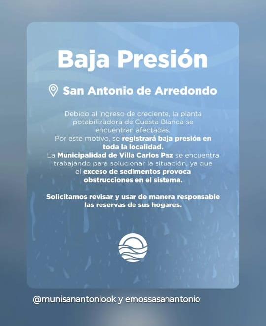 En paralelo, el municipio de San Antonio de Arredondo informó que, debido al ingreso de creciente, la planta potabilizadora de Cuesta Blanca se encuentra afectada, lo que deriva en baja presión en toda la localidad. Según se explicó, el exceso de sedimentos generado por la crecida produce obstrucciones en el sistema, complicando el normal abastecimiento.