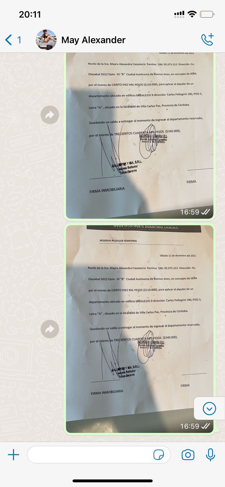 No obstante, Ballester sostuvo que lo que les llamó la atención desde un principio, a ella, a su socia y empleados, es que los mensajes recibidos por WhatsApp, “eran de un tono alarmante, mafioso”. Entre otras cosas, -sin conocer aún el departamento-” May Alexander nos decía que su marido era abogado de UOCRA y que tenía el poder de desmantelar cualquier empresa que cometiera irregularidades, en forma intimidatoria”.