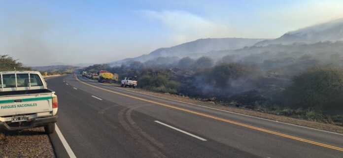 El incendio que se inició este viernes en el Parque Nacional Quebrada del Condorito continúa su marcha destructora en el sector y este domingo se combate con más de 150 bomberos voluntarios y personal del ETAC a los que se suman efectivos de la Policía de Córdoba para la seguridad del dispositivo.