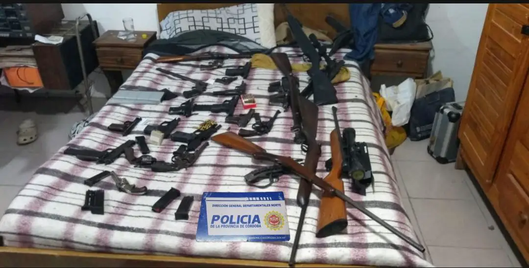 En la vivienda, personal policial secuestró 16 armas de puño de distintos calibres, 5 armas largas y 1 aire comprimido, cuya procedencia se investiga.