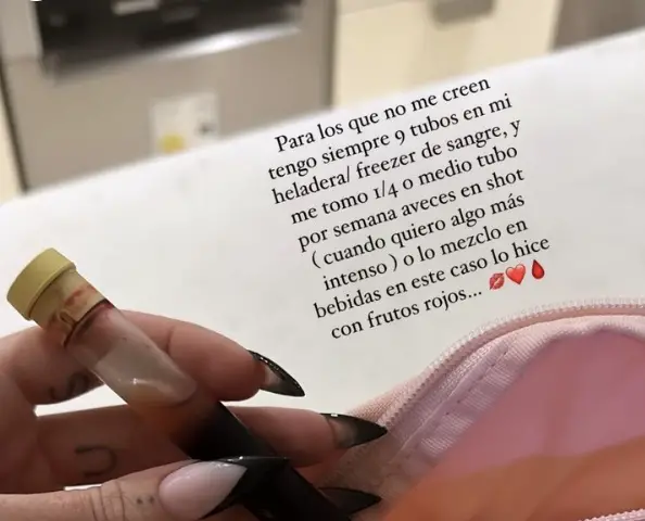 En la siguiente publicación, la mujer vinculada al dirigente político Martín Insaurralde, detalló: “Para los que no me creen, tengo siempre nueve tubos de sangre en mi heladera/ freezer y me tomo 1/4 o medio tubo por semana. A veces en shot (cuando quiero algo más intenso ) o lo mezclo en bebidas en este caso lo hice con frutos rojos”.