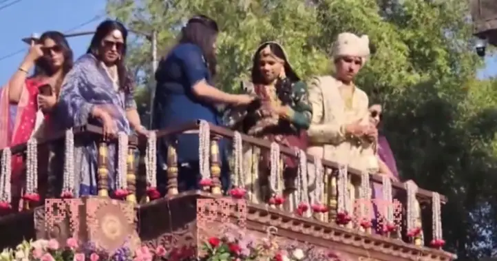 En un vídeo del momento de la ceremonia puede verse a la pareja junto a un grupo de personas subidos a una carroza decorada tirando billetes, ropa y bolsas con pertenencias a un grupo de personas que estiran sus manos para recoger todo cuanto cae sobre sus cabezas.
