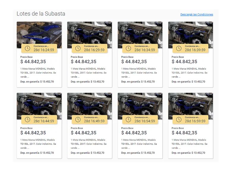 En la primera subasta, que se llevará a cabo el 26 de enero, se rematarán 246 motos 0 km de la marca Mondial, modelo TD150L del año 2017, con una base de $44.842 por unidad.