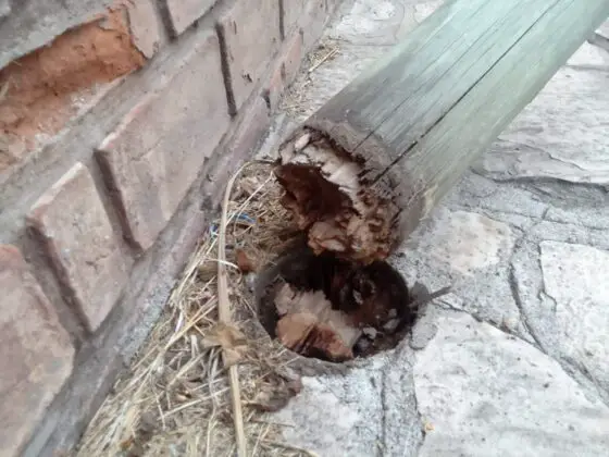 A los minutos se acercó personal de la municipalidad para analizar la situación y llevarse el poste caído, el cual presentaba claros indicios de estar podrido en su base.