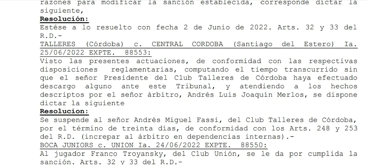 A su vez, resuelve: «Se suspende al Señor Andrés Miguel Fassi, del Club Talleres de Córdoba, por el término de treinta días de conformidad con los artículos 248 y 253 del Reglamento Disciplinario (Increpar al árbitro en dependencias internas)».