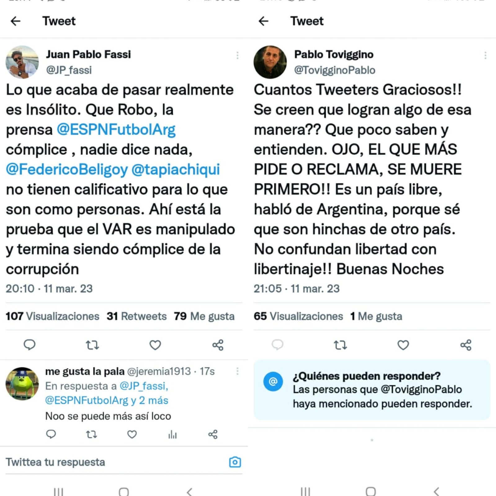 Durante el juego, ante semejante despojo, Nahuel Bustos, que se repone de un desgarro repudió todo por Twitter y, luego, Juan Pablo Fassi, ex director deportivo albiauzl e hijo del presidente T. Redobló la apuesta ya que también se había quejado en la semana. Finalmente Federico Beligoy, titular del gremio arbitral, denunció que fue amenazado, peor respaldo al VaR y a Rappallini.