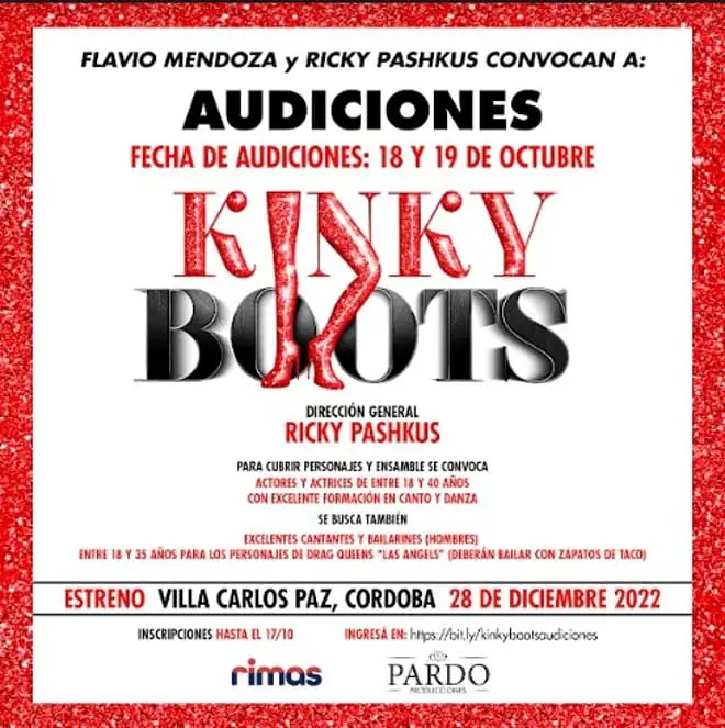 Para esta temporada de verano 2023 en Villa Carlos Paz, Flavio Mendoza y Ricky Pashkus (director teatral y coreógrafo argentino), pondrán en escena el musical Kinky Boots. Para poder llevarlo a cabo, convocan a artistas para participar de un casting que tendrá lugar los días 18 y 19 de octubre en el Teatro Luxor de la ciudad (Av. Libertad 211).