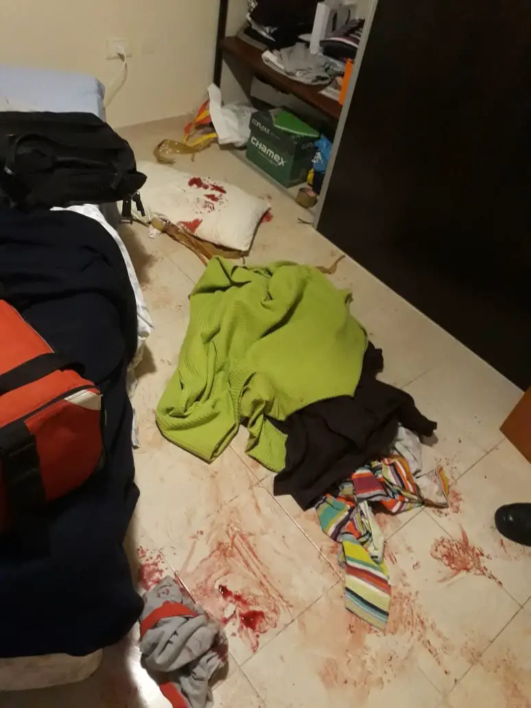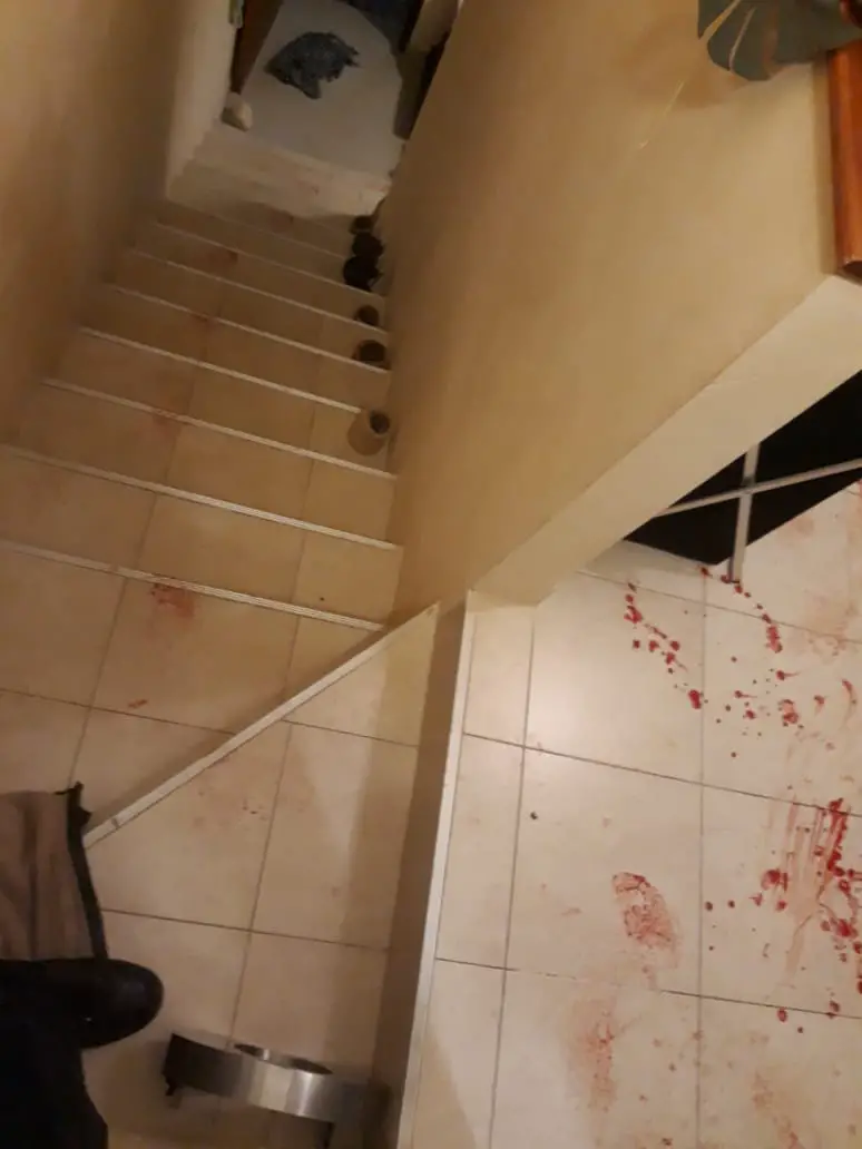 Rodeados de manchas de sangre por la planta baja, la escalera y el primer piso, los policías lograron llegar hasta una habitación al fondo del departamento donde se dieron con una terrible imagen. Una mujer de 38 años, ex pareja del sujeto, se encontraba atada de pies y manos con cinta de embalar, vendada en los ojos y con una media pegada con cinta en su boca. Además, la mujer presentaba varias lesiones, hematomas y gran parte de su cuerpo ensangrentado.