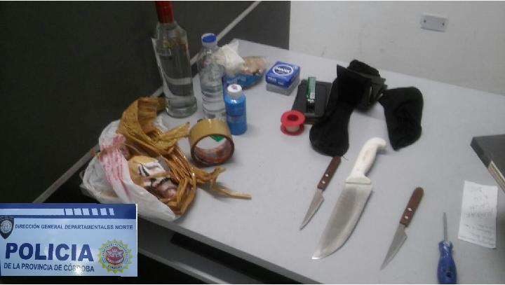 Entre las pertenencias del hombre, llevaba una mochila con una botella de alcohol etílico, una de vodka, un destornillador, dos cuchillos y una cuchilla de mayor tamaño, agua oxigenada, cinta hipoarelgénica, dos cajas de preservativos, guantes de látex y un encedendor.