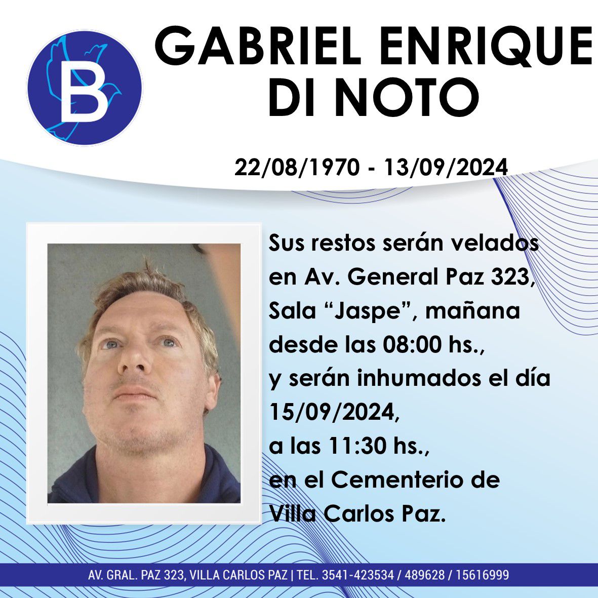La despedida de Gabriel Enrique Di Noto, quien era muy conocido en Carlos Paz, será este domingo en la sala velatoria de Empresa Brandalise, ubicada en General Paz 323. El velorio será de 8 a 11:30 horas, donde familiares y amigos podrán rendirle homenaje antes de su inhumación.