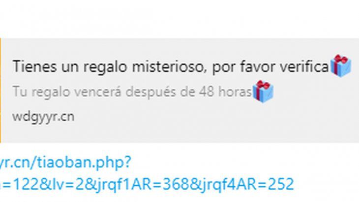 “Obtener regalos gratis. Tienes una oportunidad de conseguir regalos gratis”, dice el mensaje que está acompañado por un link.