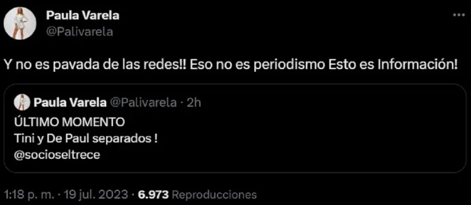 Pero esto no fue lo único, sino que la panelista de Socios del espectáculo fue por más, citó el tweet y escribió: «¡Y no es pavada de las redes! Eso no es periodismo, esto es información». Así, se hizo cargo de la información y será la apuntada en caso de que no sea cierto.