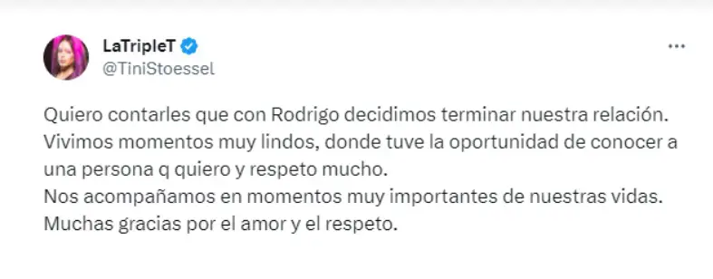 Por medio de su cuenta de Twitter, Tini Stoessel anunció el fin de su romance con el futbolista Rodrigo de Paul donde escribió: