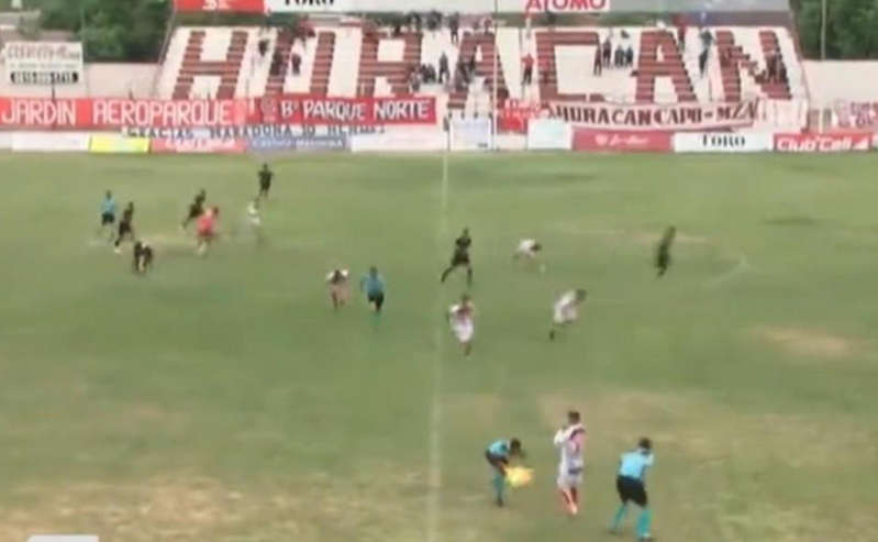 El hecho ocurrió este domingo en Mendoza, faltando quince minutos para el final del partido que Huracán de Las Heras le ganaba 3-1 a Ferro de General Pico, La Pampa. Las corridas y disparos comenzaron en las tribunas y se trasladaron al campo de juego donde el futbolísta de Carlos Paz, Agustín Díaz, vestía la casaca visitante.