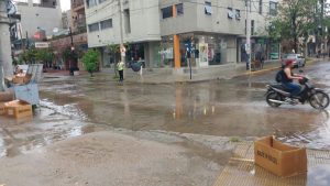 Ante la lluvia de esta tarde de martes 21 de febrero, cortaron las calles Las Heras y San Martin a la altura de la Terminal de Ómnibus al tránsito vehicular ante la acumulación de agua.