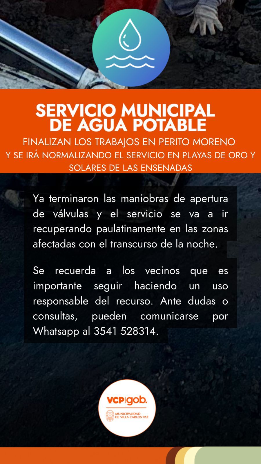 Cerca de las 19.30, la misma Subsecretaría de Agua informó sobre la finalización de las maniobras con apertura de válvulas y se comunicó que el servicio se irá recuperando paulatinamente en las zonas afectadas durante el transcurso de la noche.