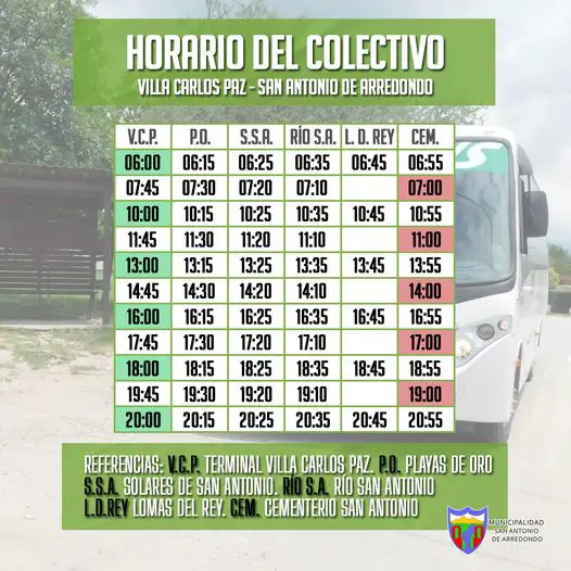 En cuanto a la frecuencia y horarios, por el momento está diagramado que, desde Villa Carlos Paz, el servicio tenga seis salidas diarias, comenzando a las 6 de la mañana y finalizando su última salida a las 20 horas (Salidas: 6, 10, 13, 16, 18 y 20 horas). En tanto, desde San Antonio de Arredondo a Villa Carlos Paz, habrá cinco salidas diarias desde las 7 a las 19 horas (7, 11, 14, 17 y 19 horas).