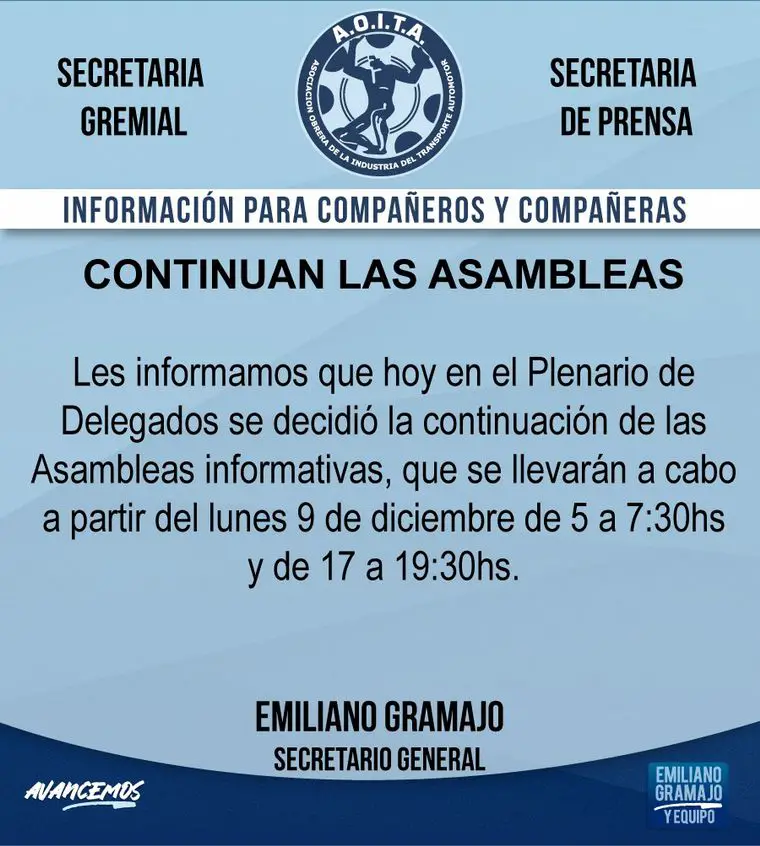Este lunes continuarán las medidas de fuerza adoptadas por la Asociación Obrera de la Industria del Transporte Automotor (Aoita) en el marco del pedido de actualización salarial y contra los despidos en la empresa Ersa.