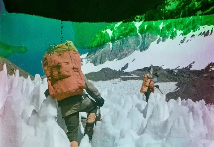 Publicada en el anuario de Mazamas ese mismo año se encuentra la fotografía opuesta, tomada por Zeller, cuesta abajo, de Johnson subiendo a la cresta de la cumbre, a unos 6.400 metros.