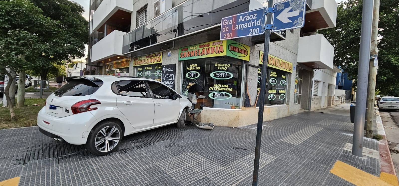 Por motivos que se desconocen, el conductor de un Peugeot 208 perdió el control del vehículo y se incrustó en una carnicería. Sólo hubo daños materiales.