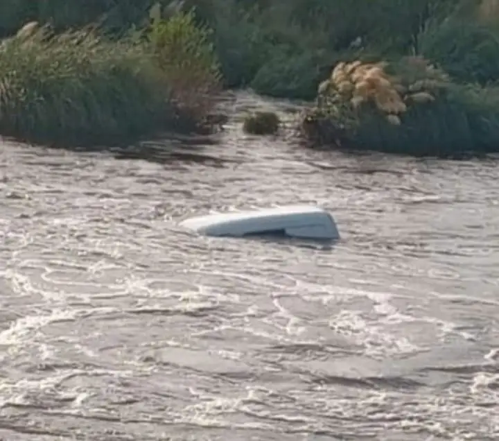 El vehículo fue arrastrado por el caudal quedó encajado en las piedras y fue tapado por el agua.