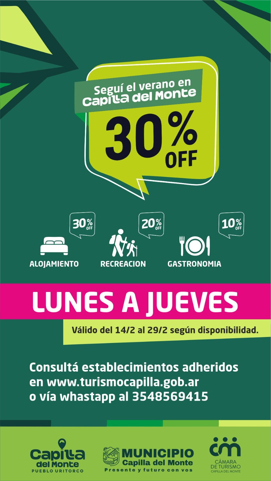 El municipio de Capilla del Monte en conjunto con la Cámara de Turismo local lanzaron un programa de promoción para alojamiento, gastronomía y servicios para lo que resta de febrero.