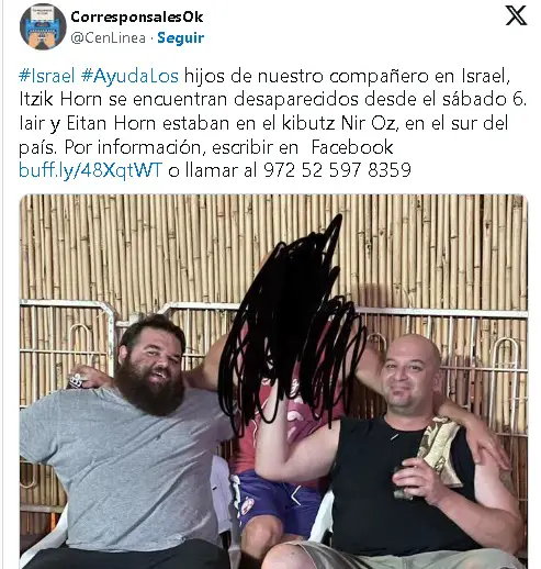 Itzik Horn pide por el paradero de Iair y Eitan, que se encontraban en el kibutz Nir Oz, cercano a la Franja de Gaza, cuando inició el ataque del grupo extremista.